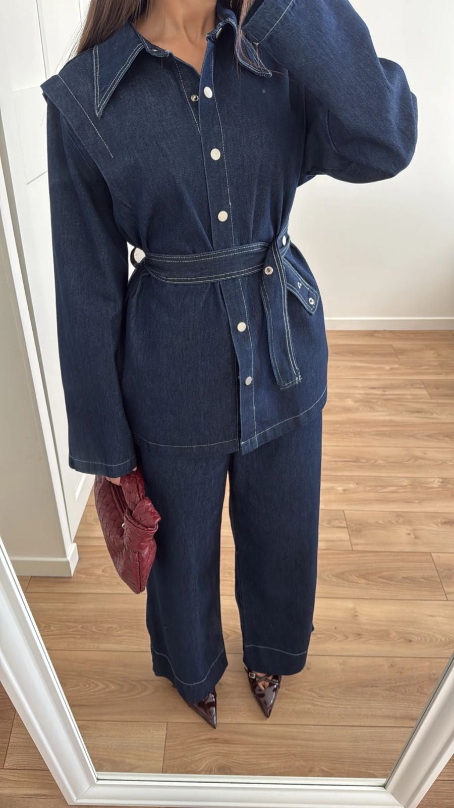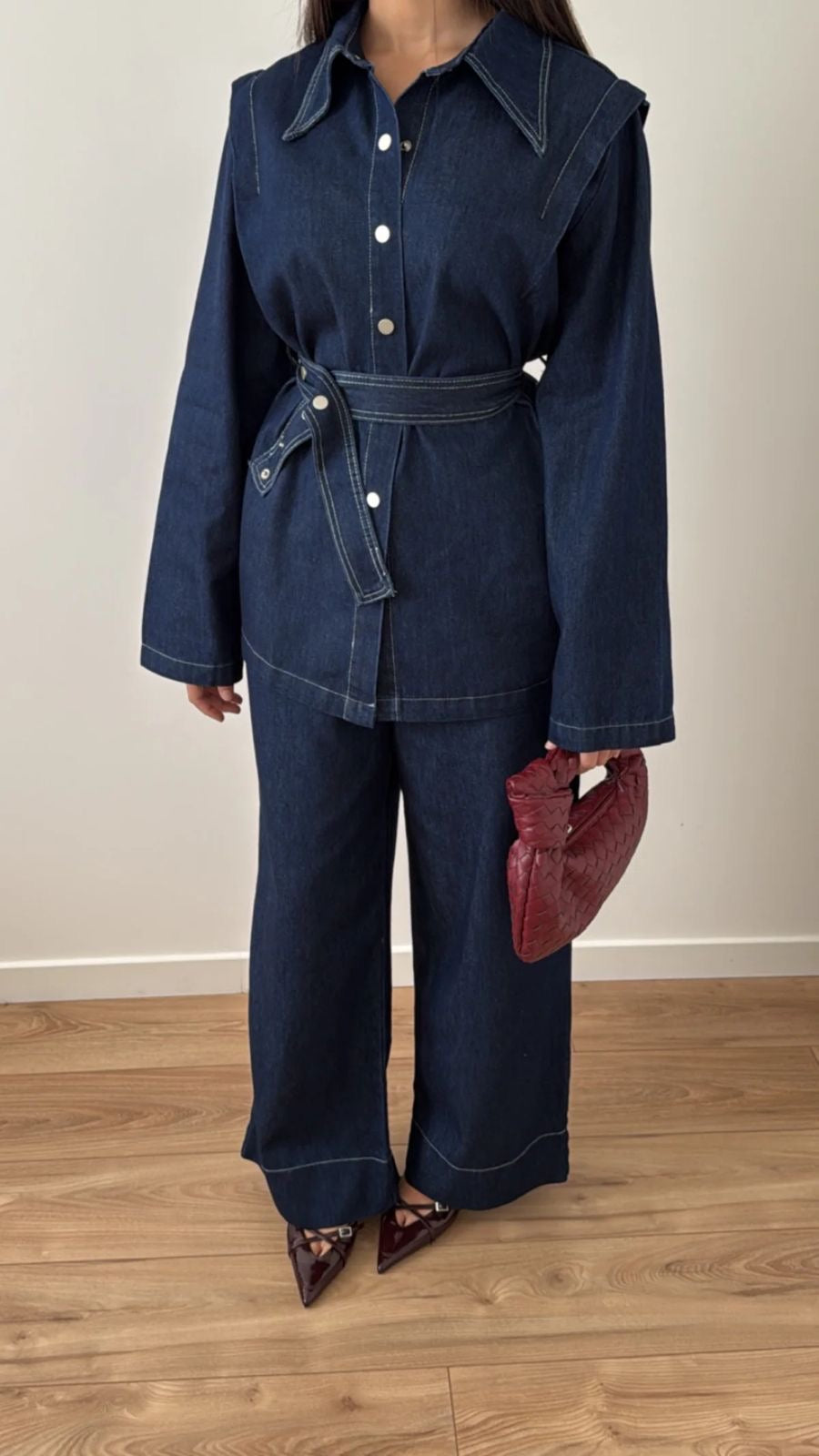 Denim set, wide straight pants, jacket with belt, oversized cut