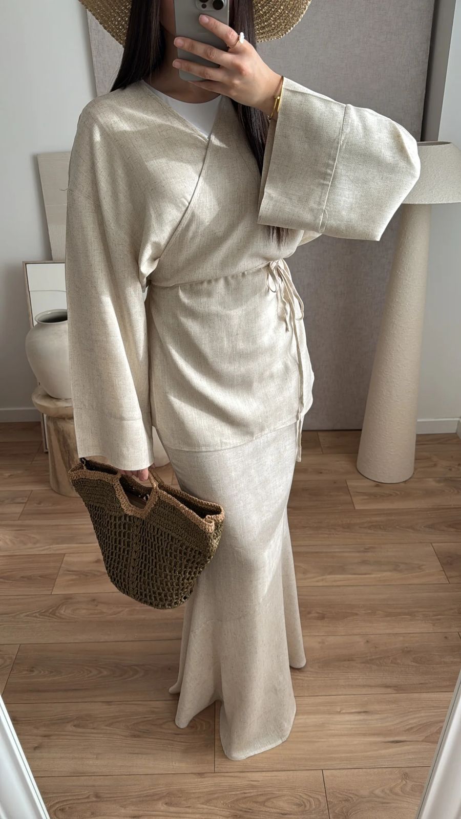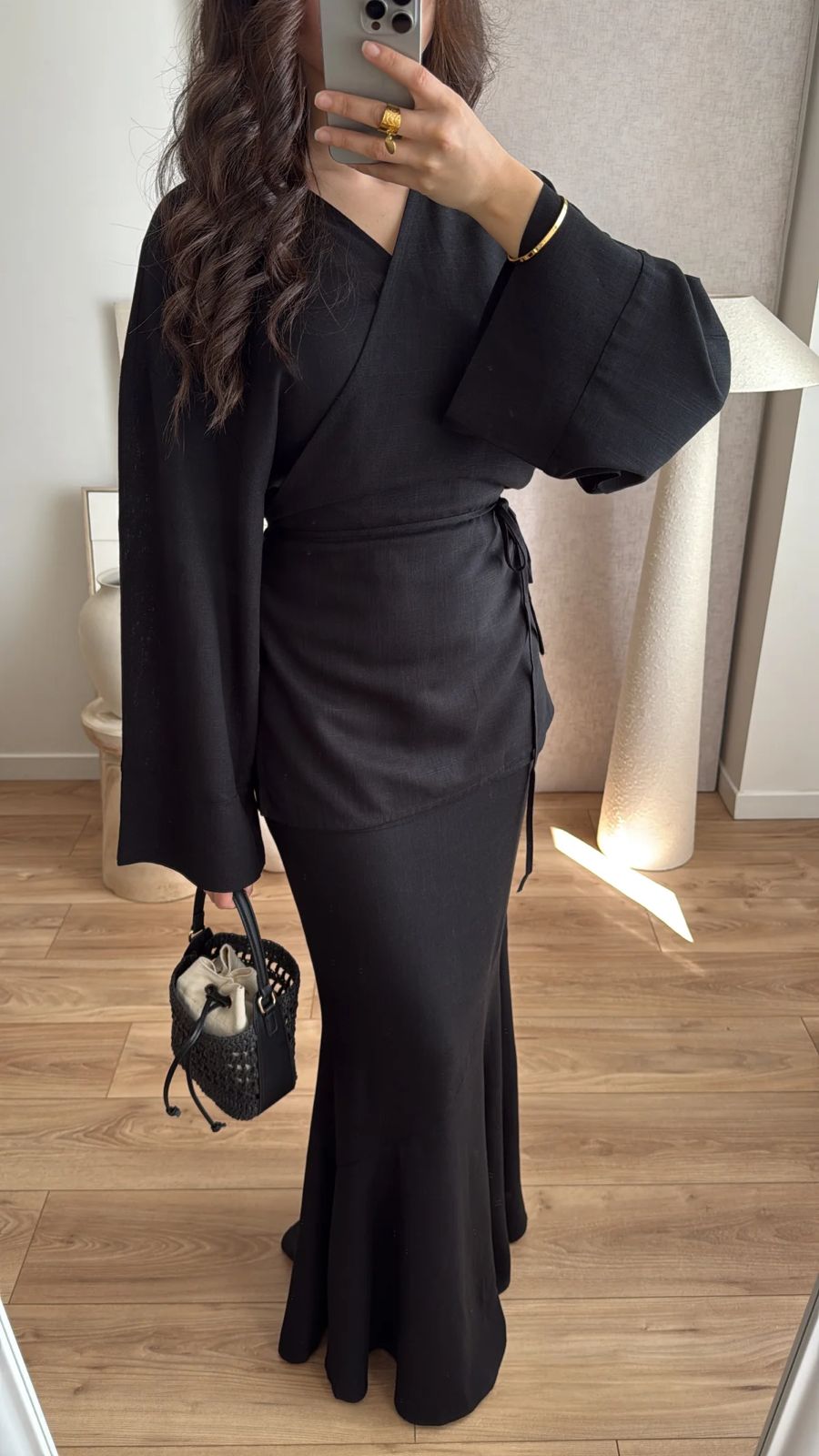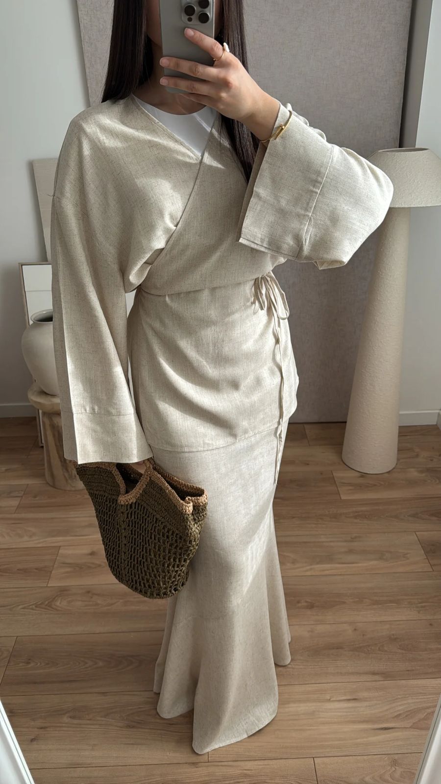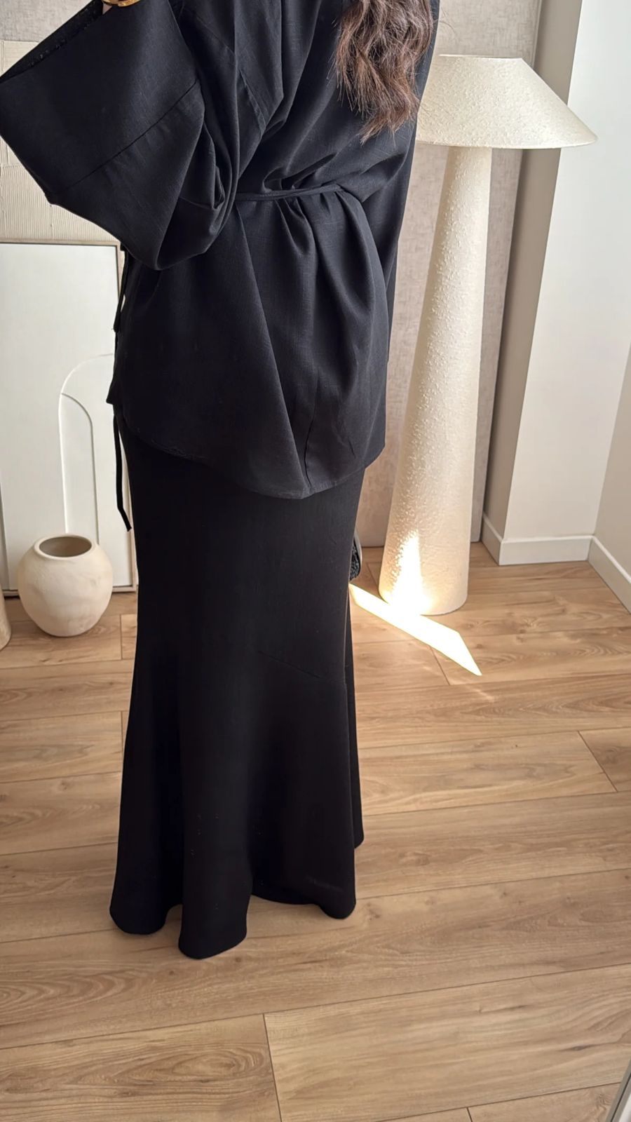 Long wrap shirt with flared sleeves and skirt