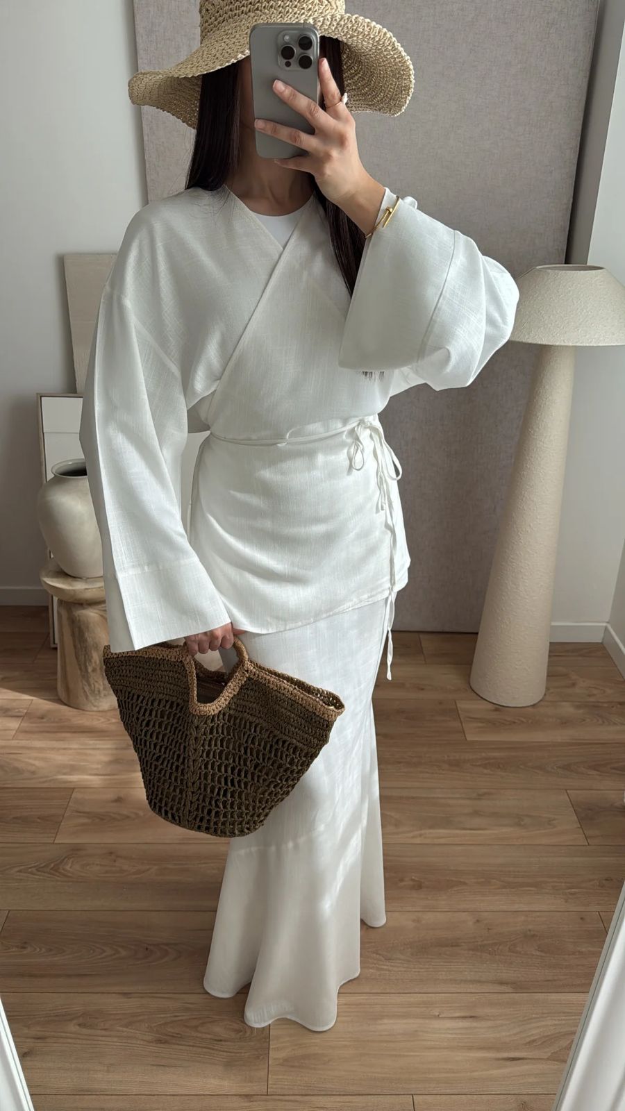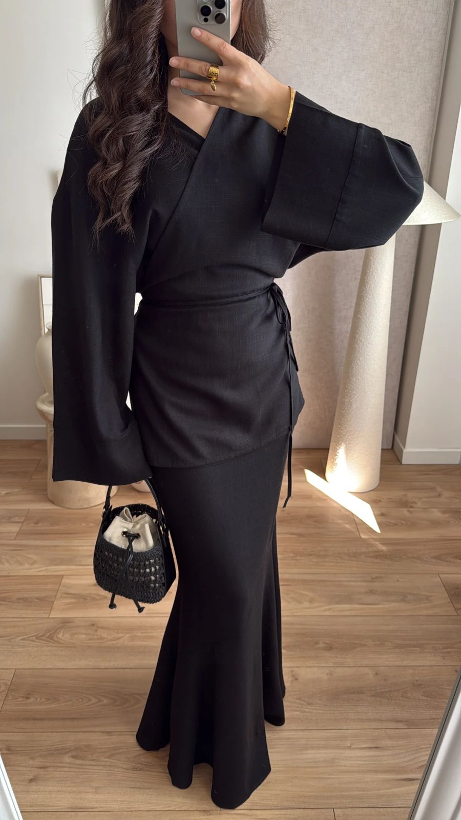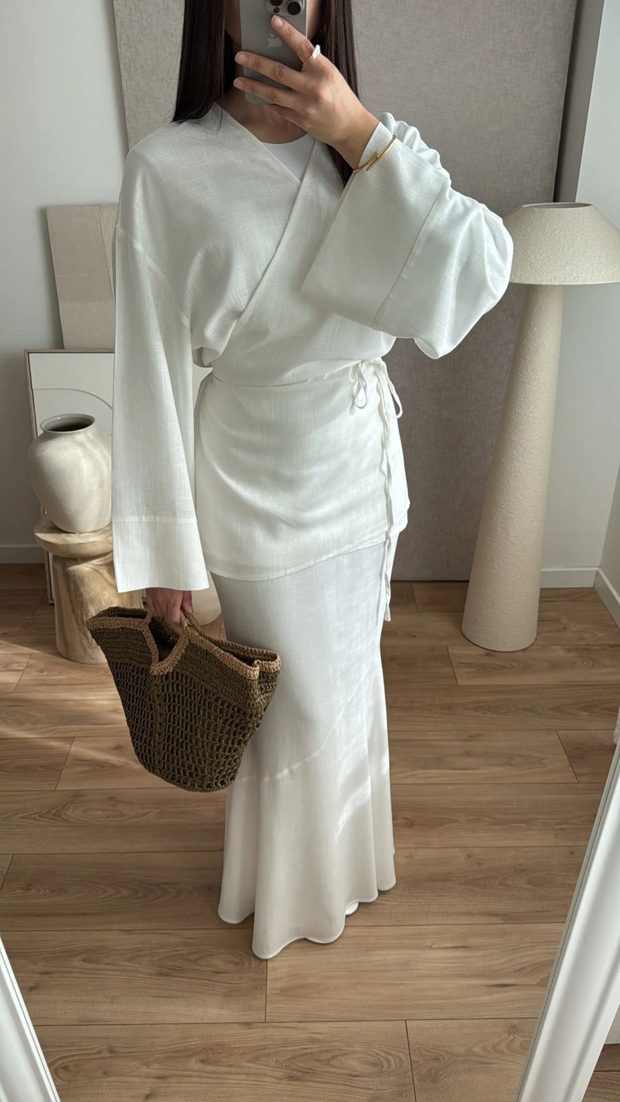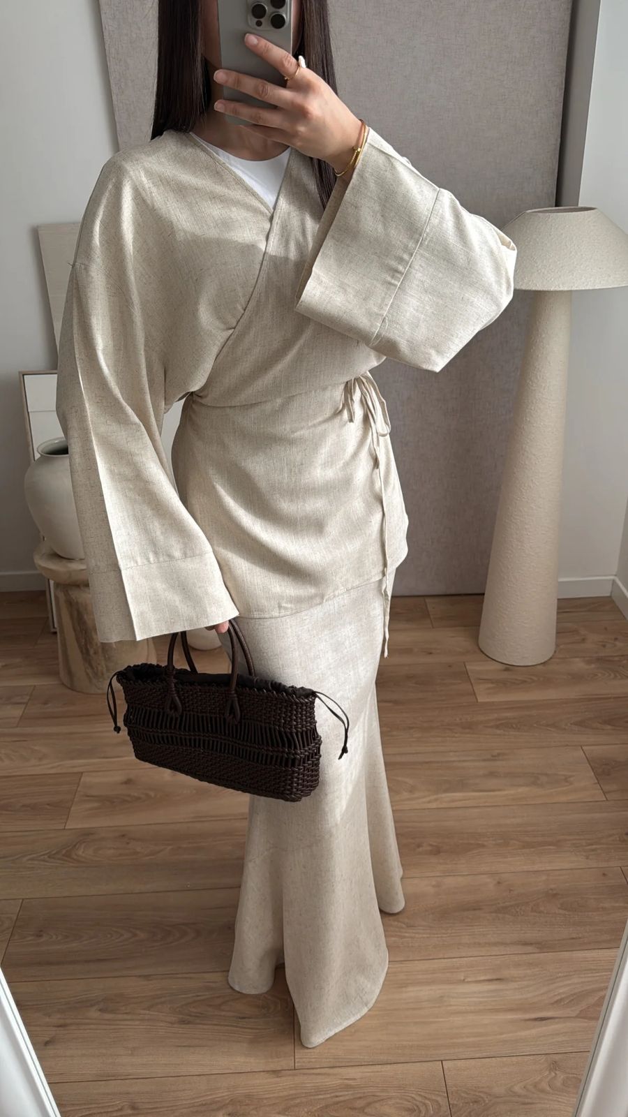 Long wrap shirt with flared sleeves and skirt